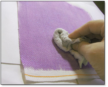 Once the surface of the canvas looks even, turn the canvas over to the backside and blot with the terry cloth towel to remove the final excess paint.
